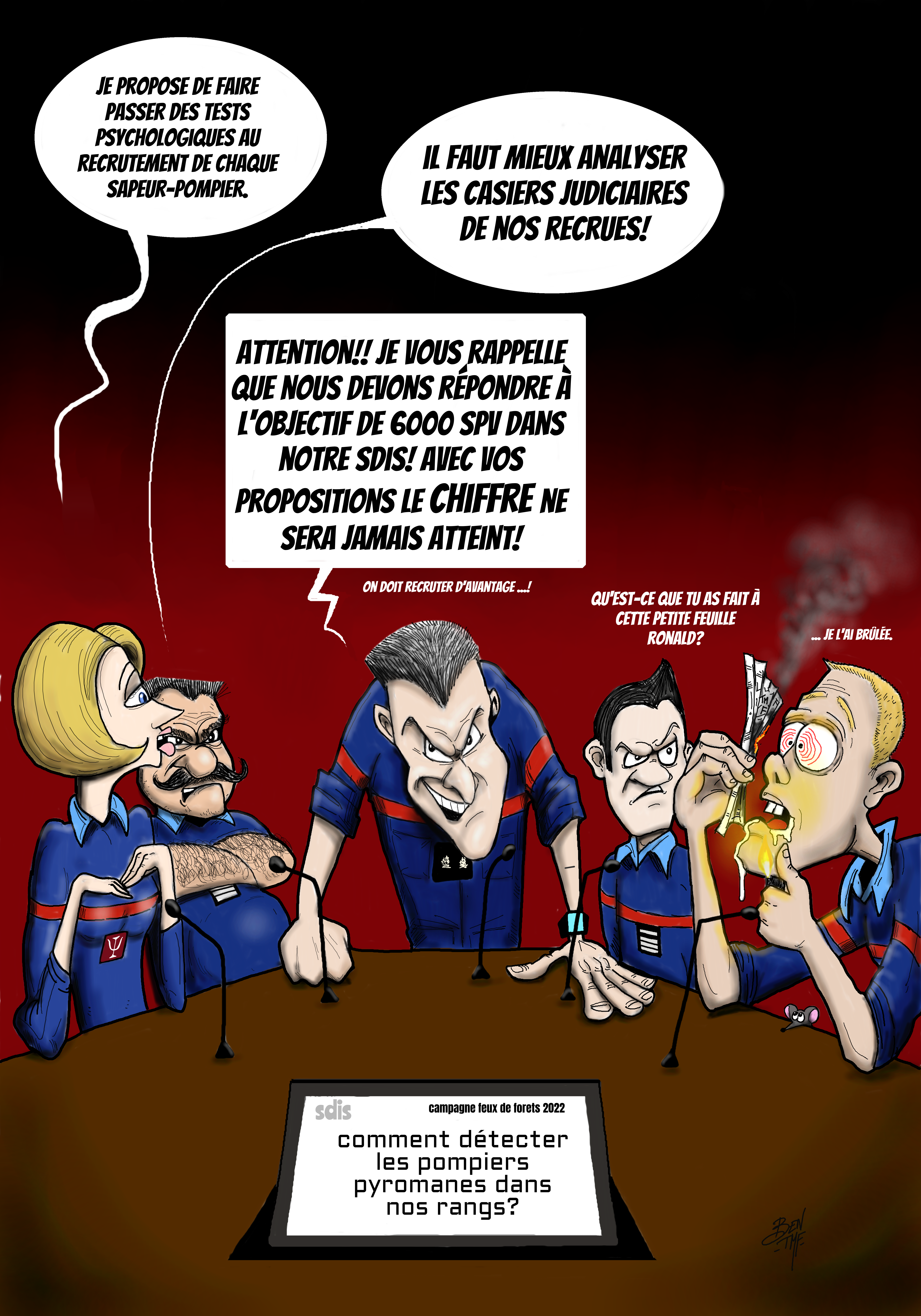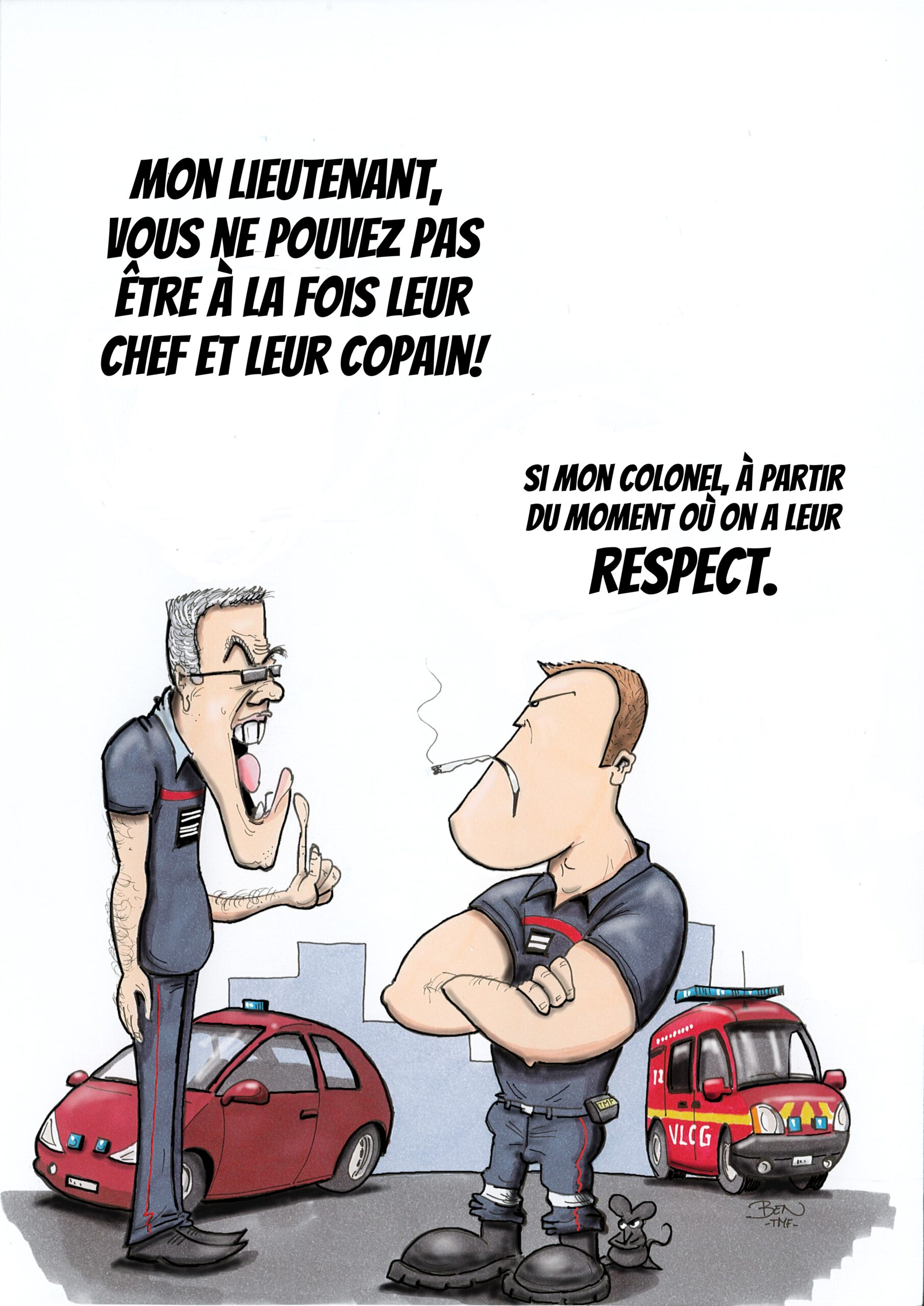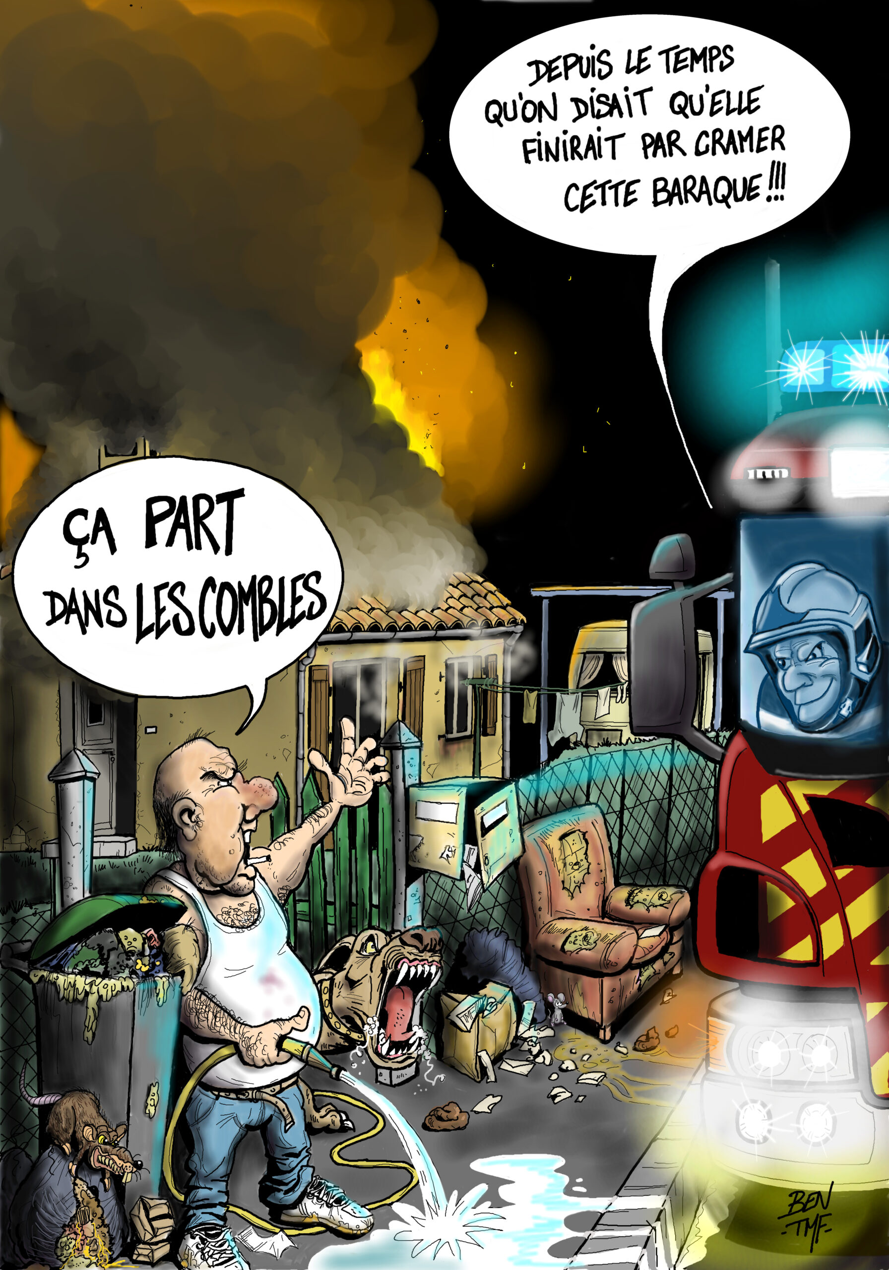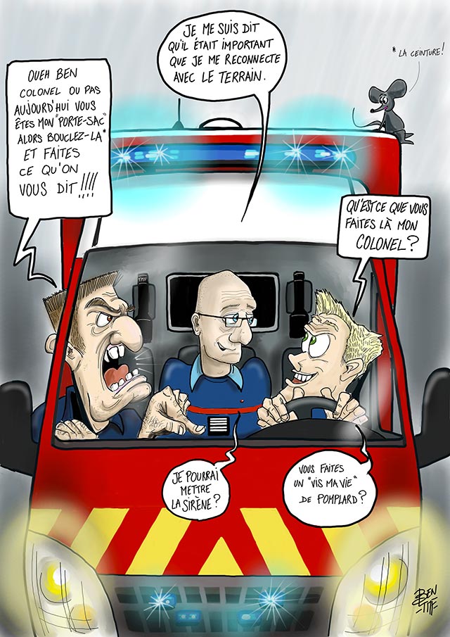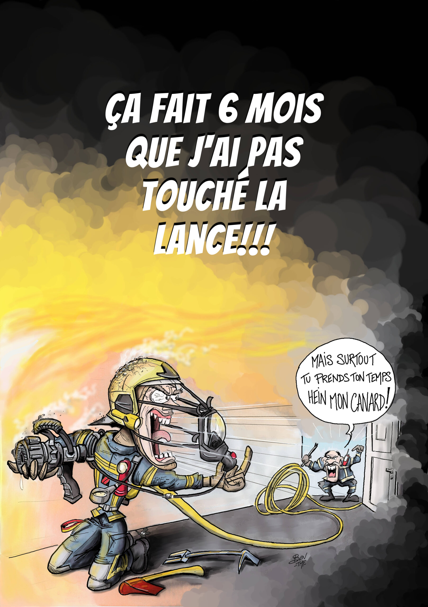 « BEN TMF » est pompier professionnel. Ses ouvrages de dessins « ça part dans les combles » TOME 1 et TOME 2 sont disponibles aux éditions Soldat du Feu. Depuis 2013, il illustre la dernière page du magazine des pompiers de France, Soldat du feu.