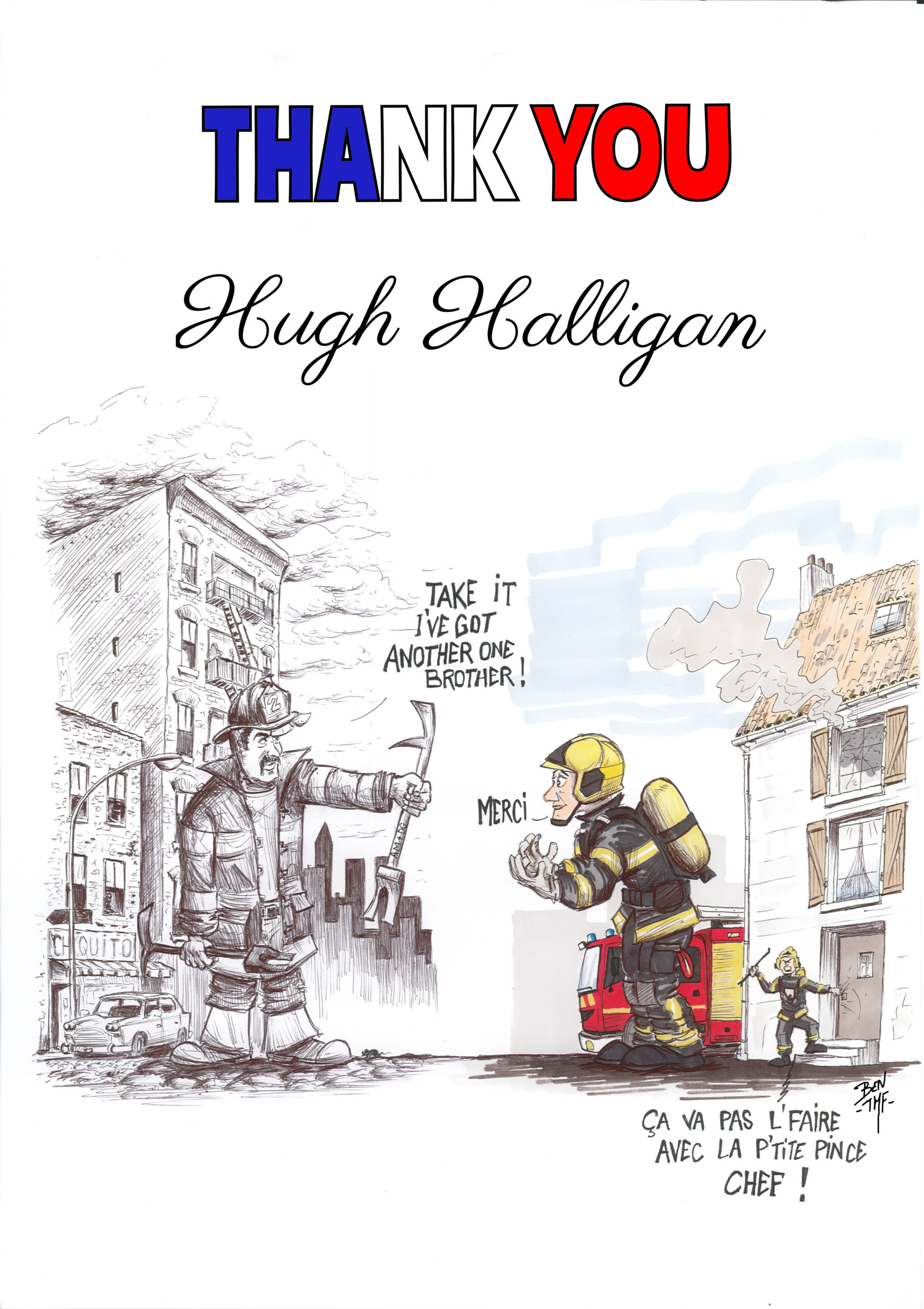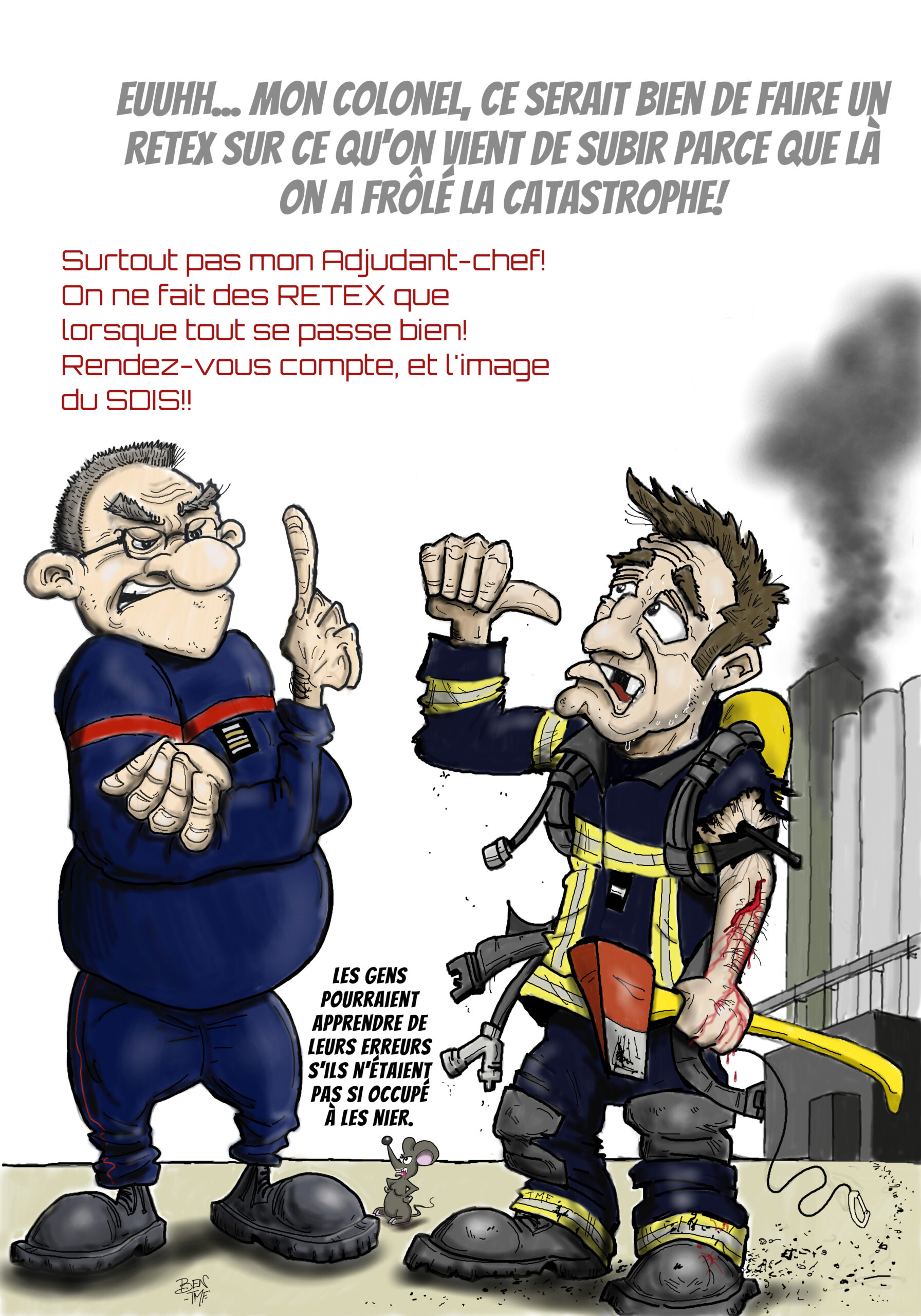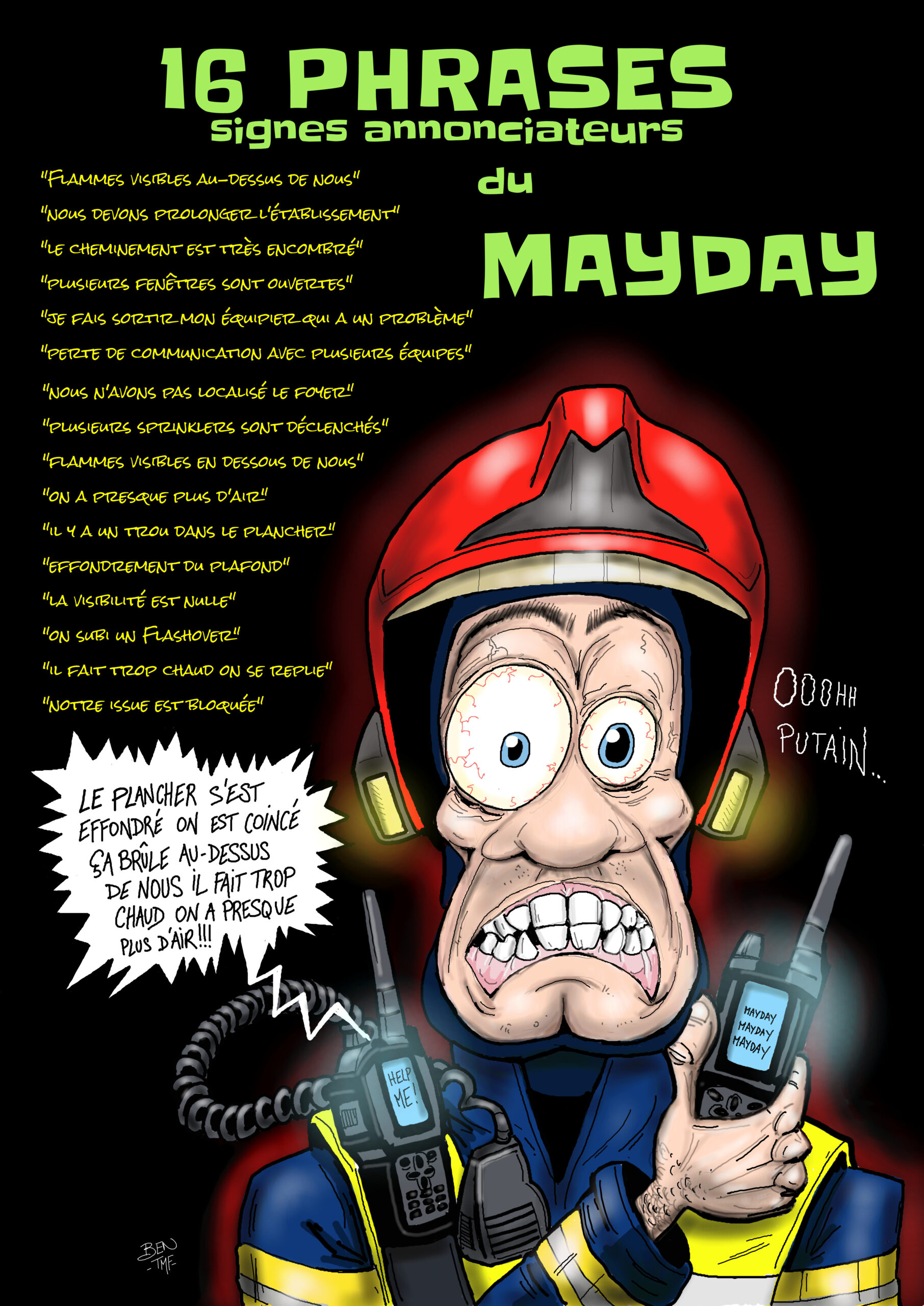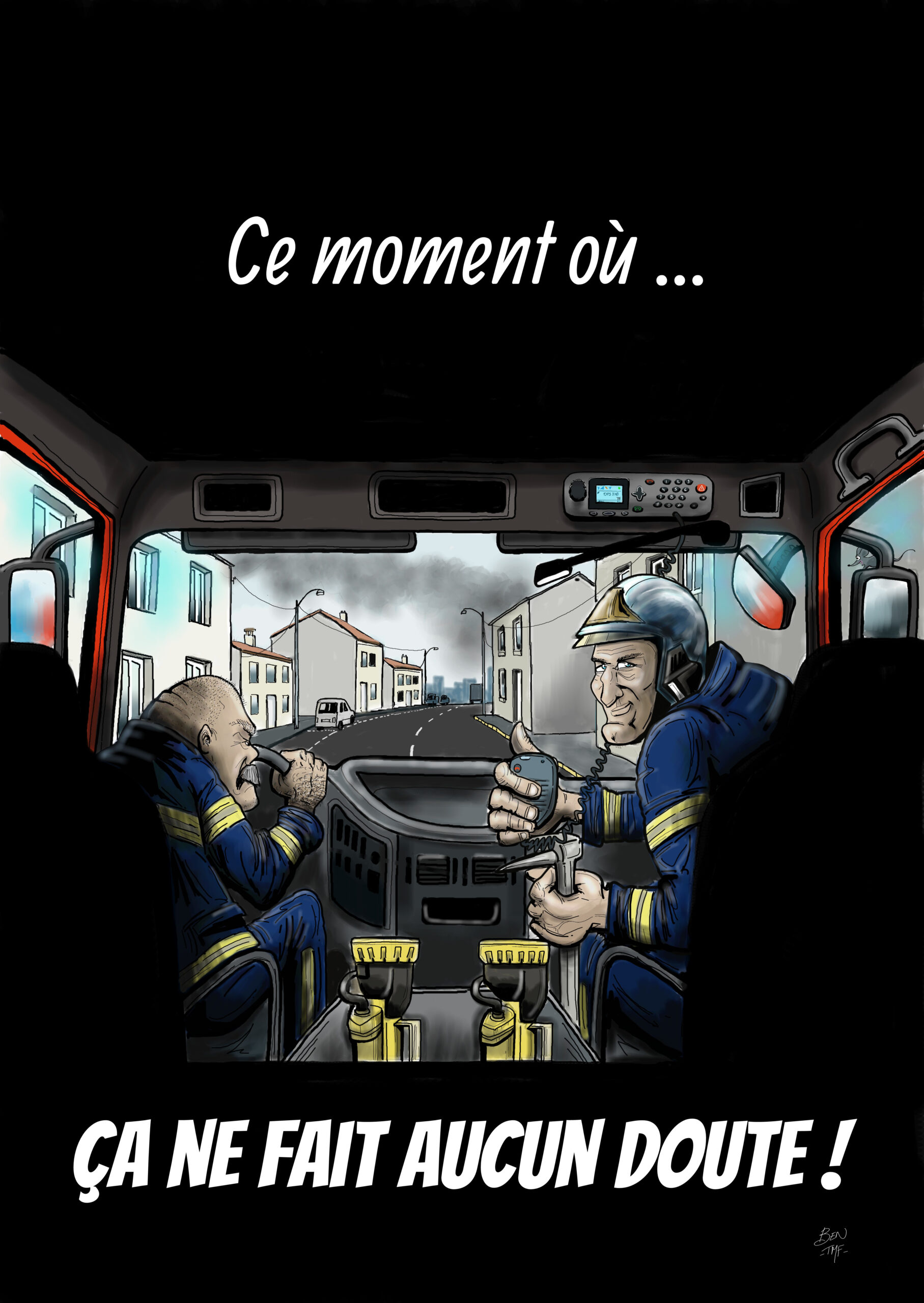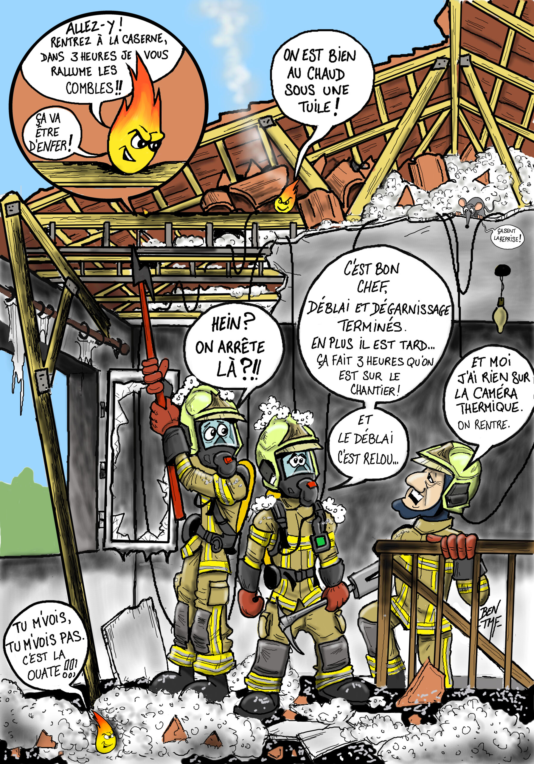 « BEN TMF » est pompier professionnel. Ses ouvrages de dessins « ça part dans les combles » TOME 1 et TOME 2 sont disponibles aux éditions Soldat du Feu. Depuis 2013, il illustre la dernière page du magazine des pompiers de France, Soldat du feu.